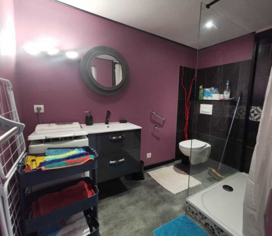 Derrière le séjour, vous pourrez vous détendre dans une belle chambre pour deux personnes avec un lit double 160x200 cm qu'il est possible de séparer en deux lits simples 80x200 cm, leurs tables de chevet avec lampes ainsi qu'une grande armoire de rangement. Le gîte possède également une salle d'eau avec une douche, un WC, une vasque avec miroir et une machine à laver.